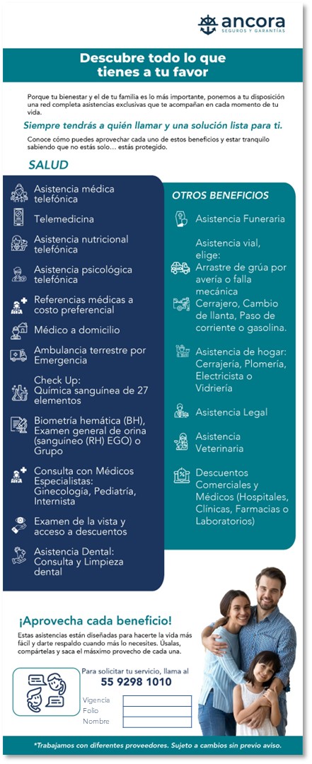 Es un programa de servicios de apoyo que brinda orientación, coordinación y/o prestación de asistencias médicas y de otros rubros (vial, hogar, legal, funeraria, veterinaria y descuentos) mediante una red de proveedores, de acuerdo con límites, condiciones y disponibilidad establecidos.